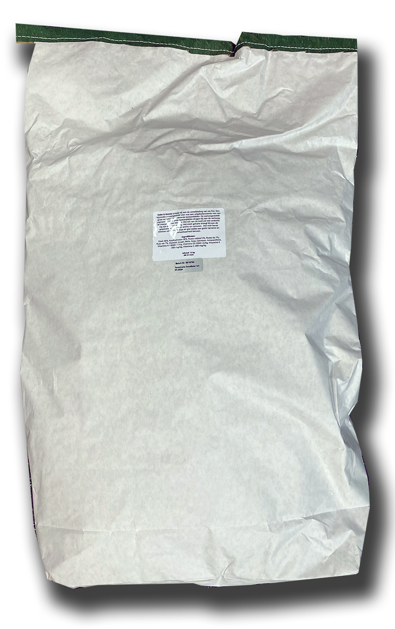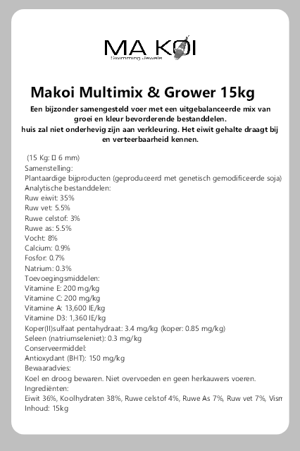 Eiwit 36%, Koolhydraten 38%, Ruwe celstof 4%, Ruwe As 7%, Ruw vet 7%, Vismeel, Graan, Maïs, Soja, Catoteen, Astaxanthine, Vitamine A 13000 I.E/kg, Vitamine D3 2000 I.E/kg, Vitamine E 200mg/kg, Vitamine C 200 mg/kg