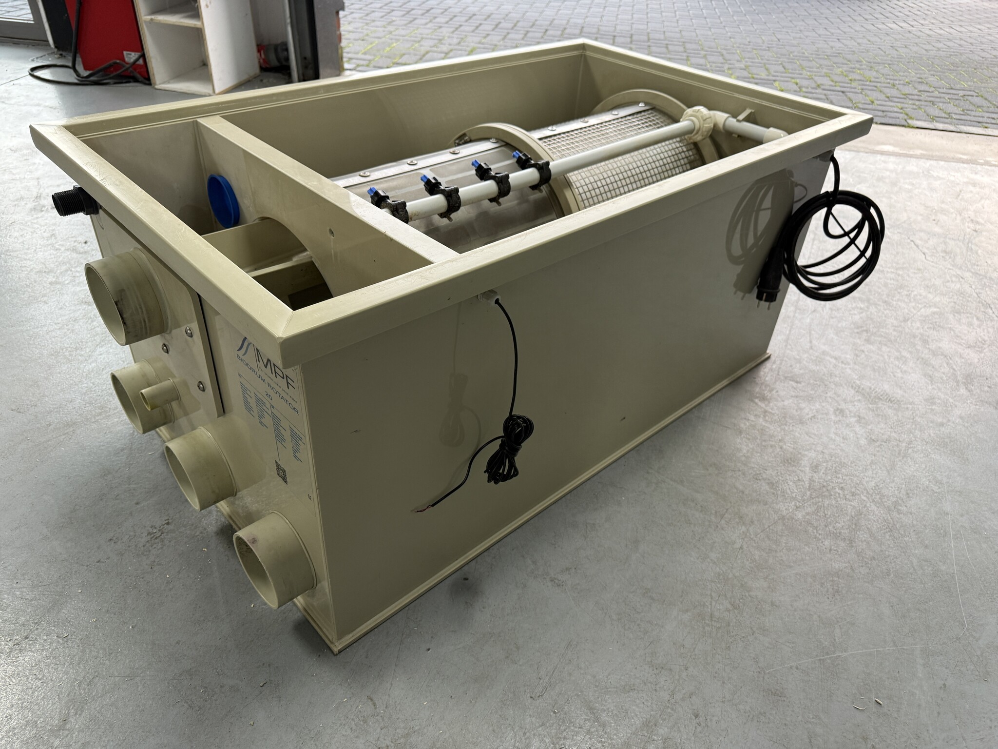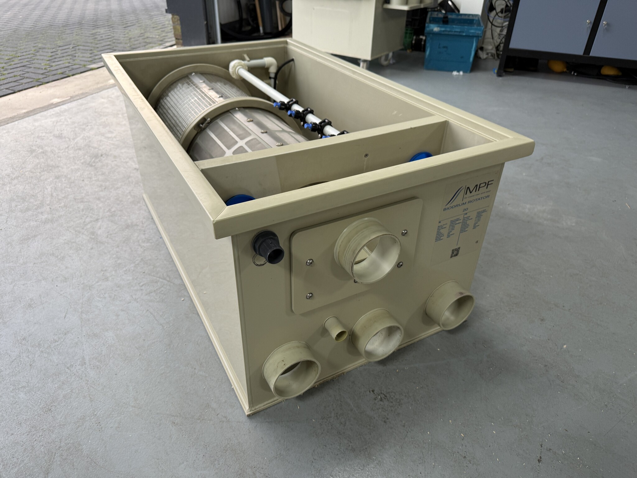 Deze MPF Biodrumrotator 20 heeft een Trommelfilter met een High Flow Zeefdoek van 120 micron en een RBC (Rotating Biological Contactor) er aan vast. Gevuld met Hel-x 13 als Bioloog (995 m²/m³)